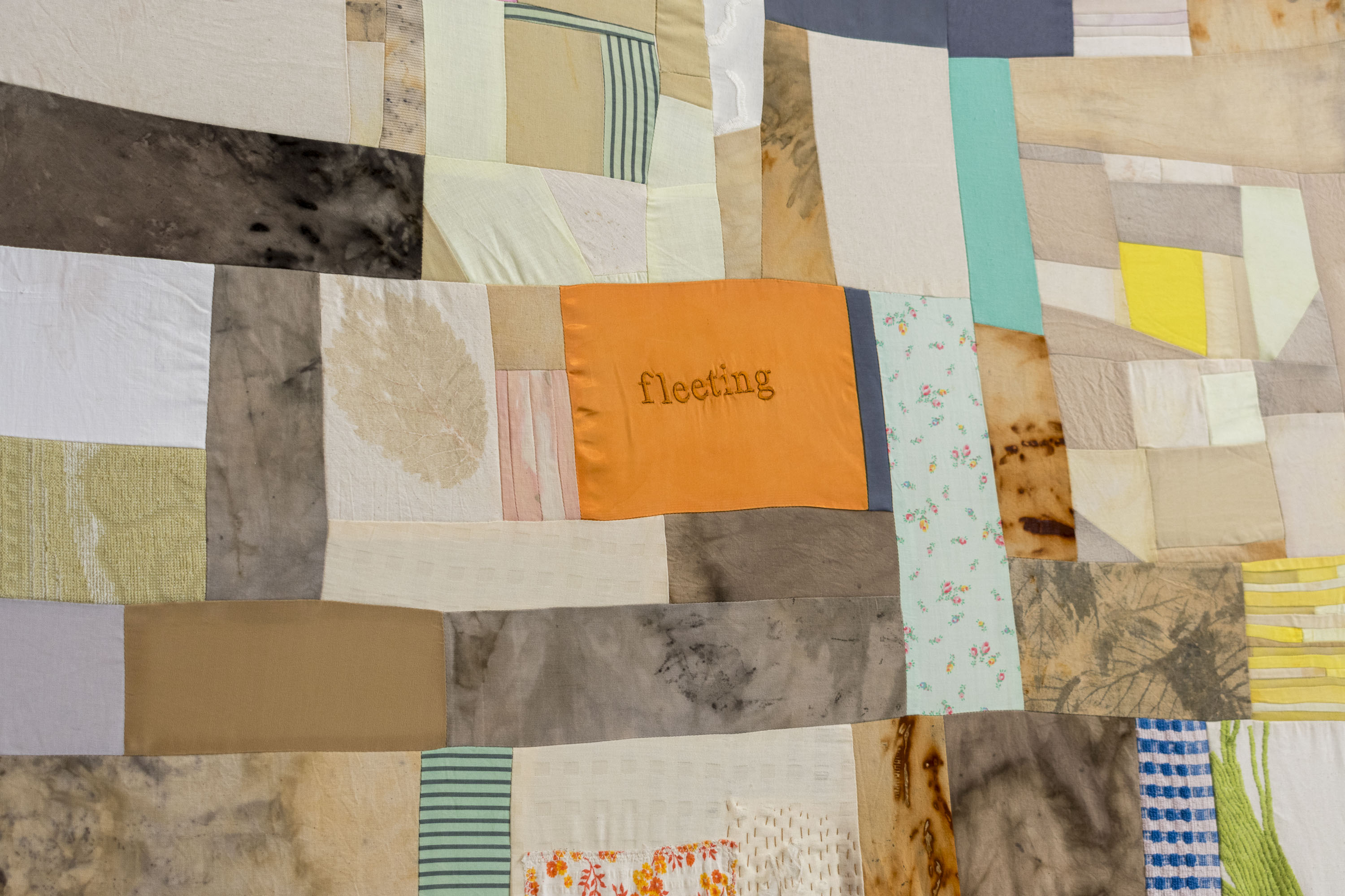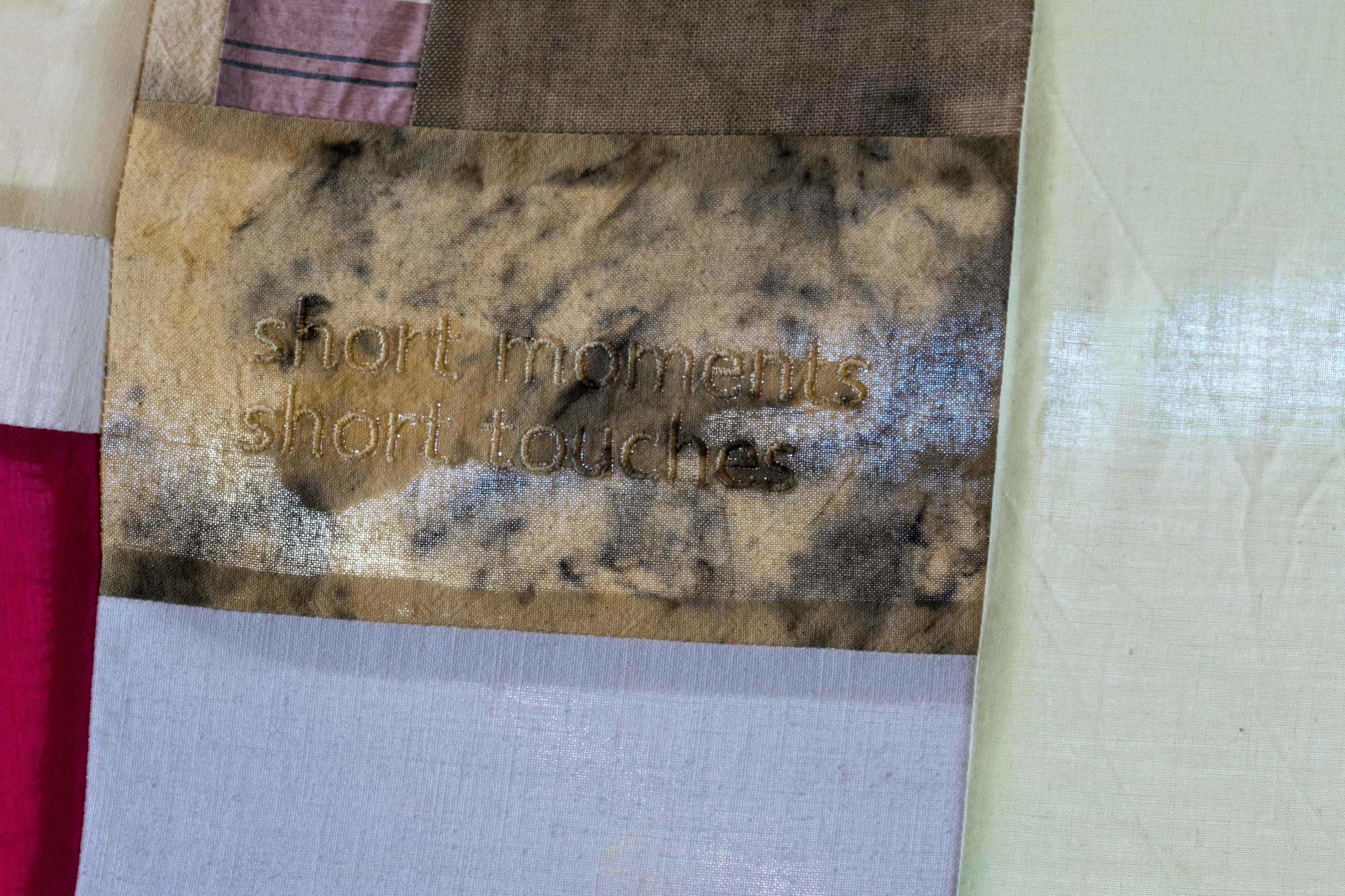 Lappeteknikk og maskinbroderi: funne tekstilar i polyester, viskose, silke og ull i kombinasjon med farga bomull, oppspent på treramme