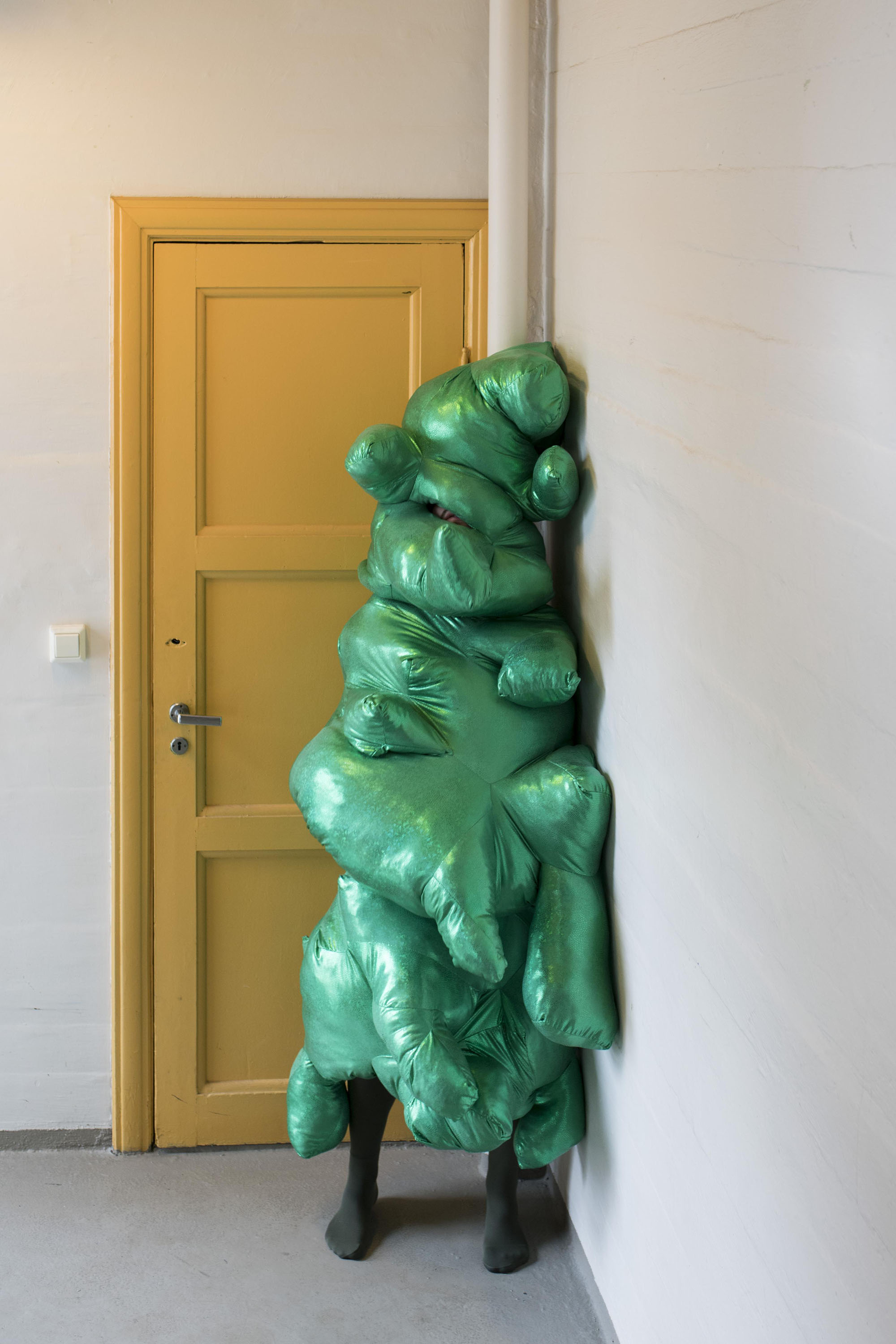 Two performers dressed in suits that block the visual field and limits movement. They could only interact with eachother by using the voice, to sing out to one another from different levels in a stairwell. The audience could pass by while going to the different floors of the building, which houses Kunstnerverksteder and Aldea in C. Sundts gate 55 in Bergen.