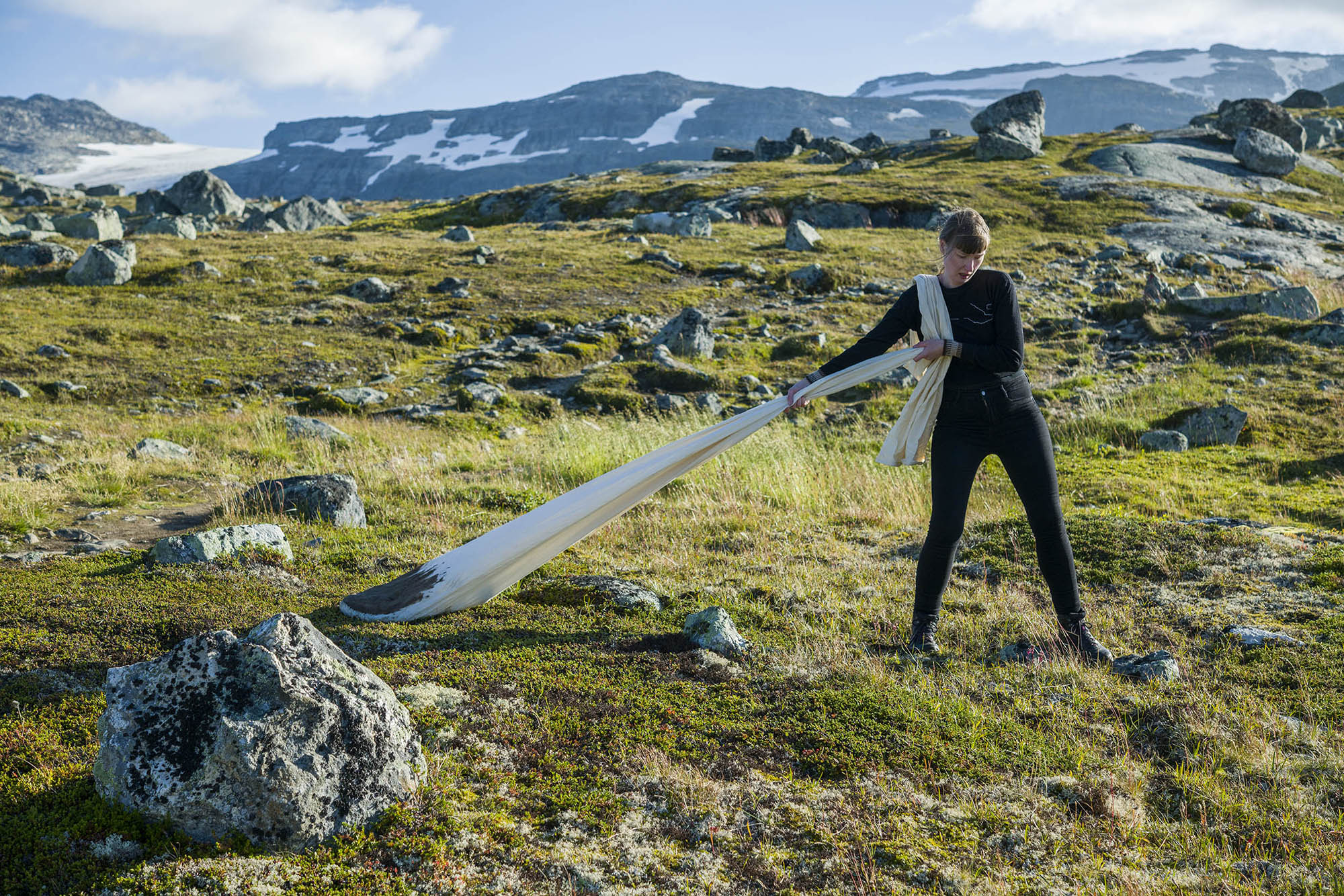 I pulled a long cotton sack along a trail. The sack was filled with stones from Finsevatn. The mud from the trail dyed a small cotton vessel which was placed inside the sack. The small vessel was then filled with the stones and carried further to the nearest body of water.